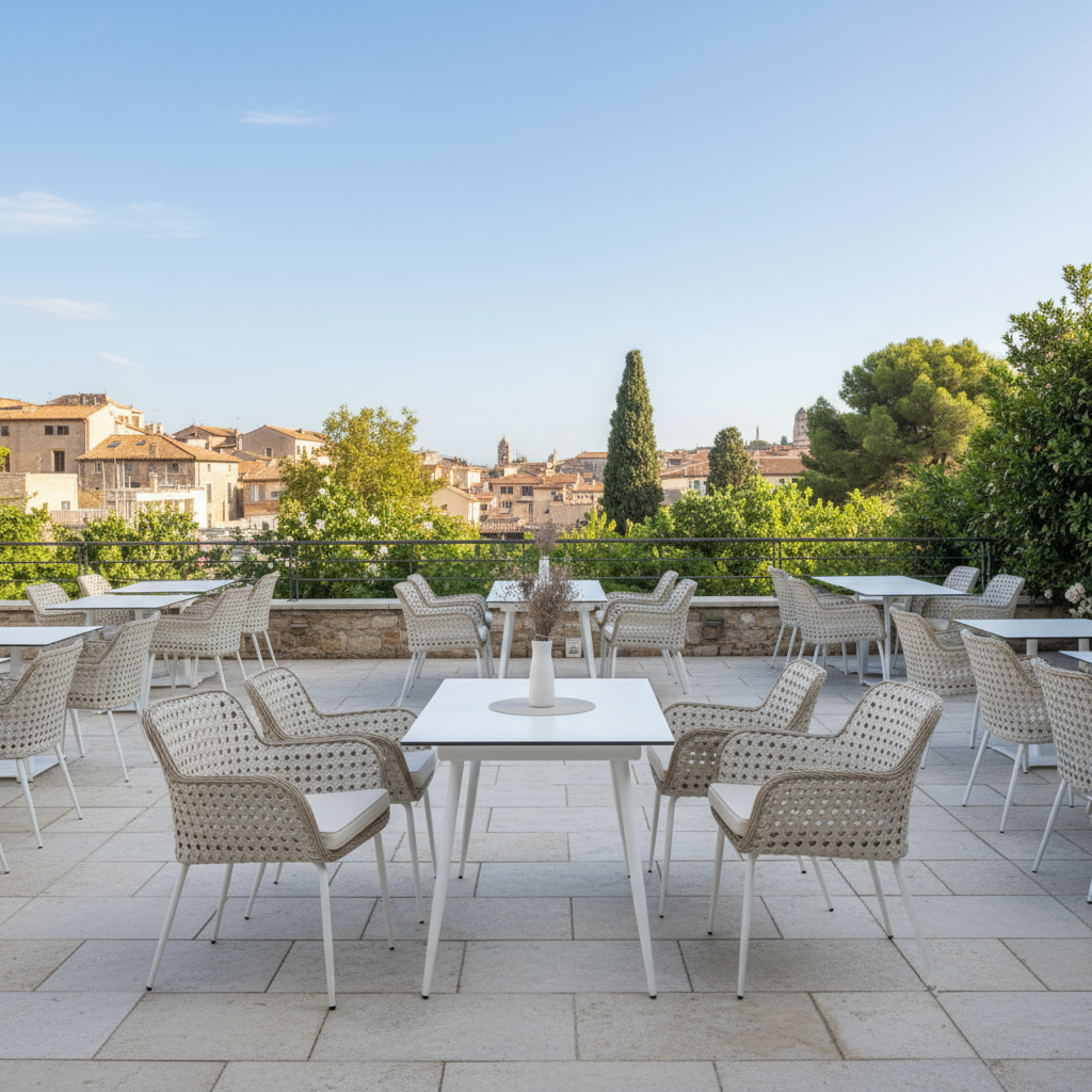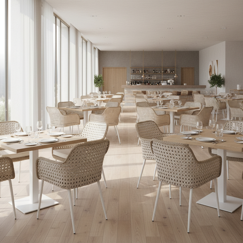 Krzesło VENTO BIS to model inspirowany stylem śródziemnomorskim i prowansalskim, który łączy lekką konstrukcję aluminiową z dekoracyjną plecionką rattanową oraz komfortowym tapicerowanym siedziskiem. Charakterystyczna, bardziej geometryczna forma oparcia nadaje krzesłu nowoczesny wygląd, dzięki czemu doskonale sprawdza się zarówno w ogrodach i na tarasach, jak i w restauracjach oraz przytulnych wnętrzach.