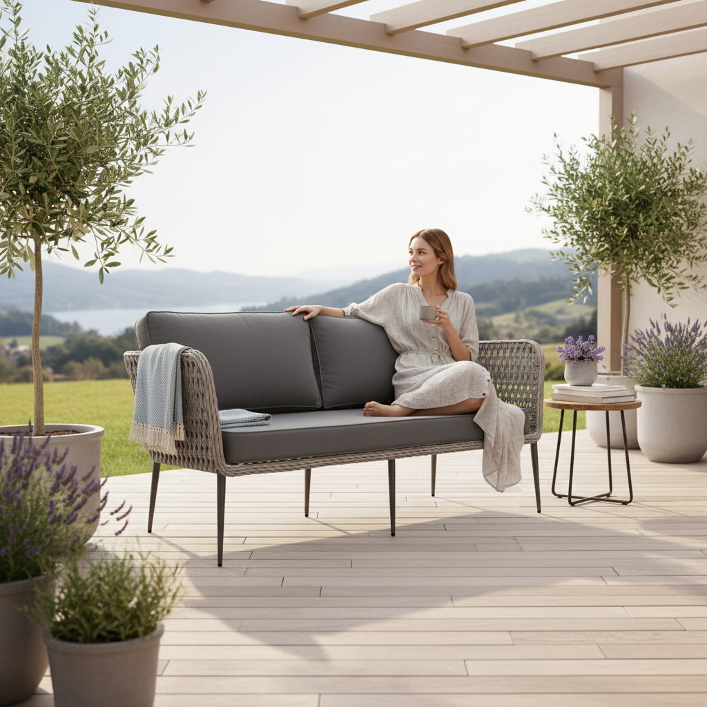 Sofa VENTO w kolorze latte doskonale wpisuje się w aranżacje inspirowane południem Europy. Jasna kolorystyka konstrukcji i plecionki nadaje meblowi lekkości i naturalnego charakteru, który świetnie komponuje się z drewnem, kamieniem oraz roślinnością ogrodową.
