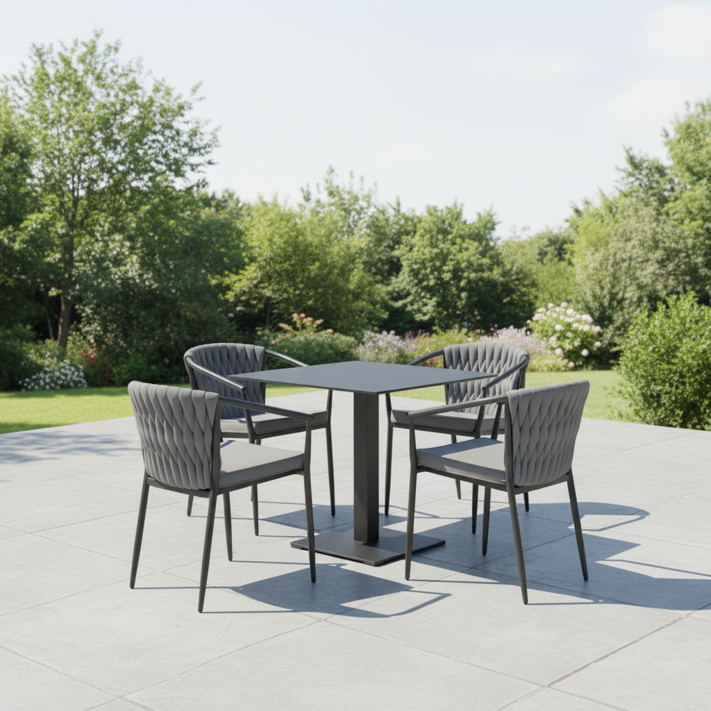 Zarówno krzesła, jak i stół wykonane są z lekkiej konstrukcji aluminiowej malowanej proszkowo. Aluminium zapewnia odporność na wilgoć, promieniowanie UV oraz intensywne użytkowanie, dzięki czemu zestaw może być użytkowany przez wiele sezonów.