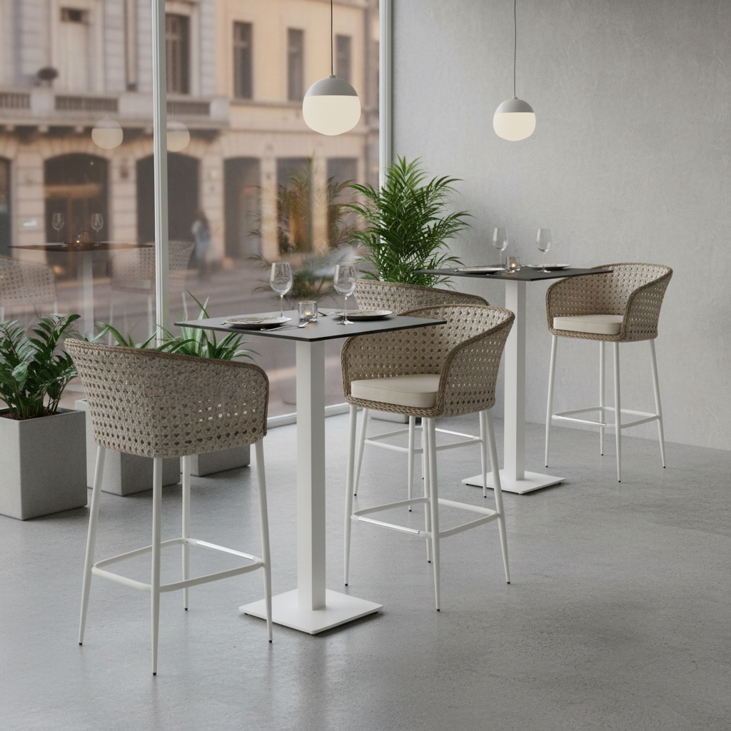 Zestaw barowy VENTO + stół ARCO to eleganckie połączenie inspirowane stylem śródziemnomorskim. Dwa krzesła barowe z dekoracyjną plecionką rattanową oraz stabilny stół z aluminiową konstrukcją i trwałym blatem HPL tworzą funkcjonalną strefę spotkań idealną na taras, do ogrodu, restauracji lub przy domowej wyspie kuchennej.